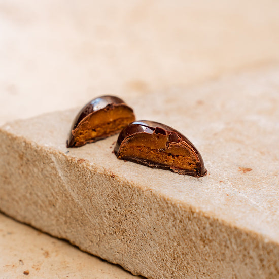 Gourmandise et douceur pour la fête de l'amour avec ces délicieux bonbons de chocolat pur noir 76% fourrés d'un cœur caramel fleur de sel praliné cacahuètes.