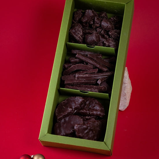 Un coffret 3 gourmandises fait spécialement pour les fêtes et regroupant nos 3 fruits confits enrobés : Citrons confits bio enrobés (écorces), Gingembres confits bio enrobés, Oranges confites bio enrobées (demi-tranches).