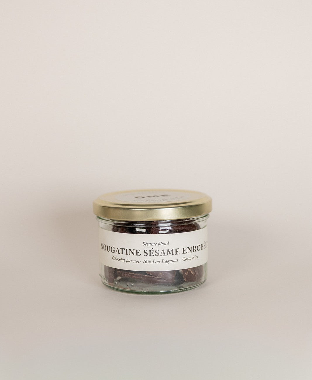 Des nougatines de sésame réalisées dans notre atelier et enrobées de chocolat pur noir 76% Finca Los Angeles (El Salvador).